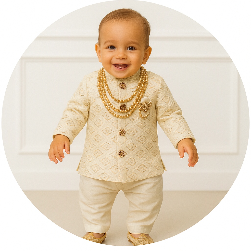 More sizes availableInfants Traditional IndoWestern set - Chain and shoes includedVendor: Mommies KidsType: Boys Indo western Set Lining included Material: Blend Silk Full set Chain and Shoes Included Wash and Ironing Instructions: Machine wash cold with like colors Gentle cycle Use mild detergent Do not bleach Tumble dry low Iron on low heat if needed Do...