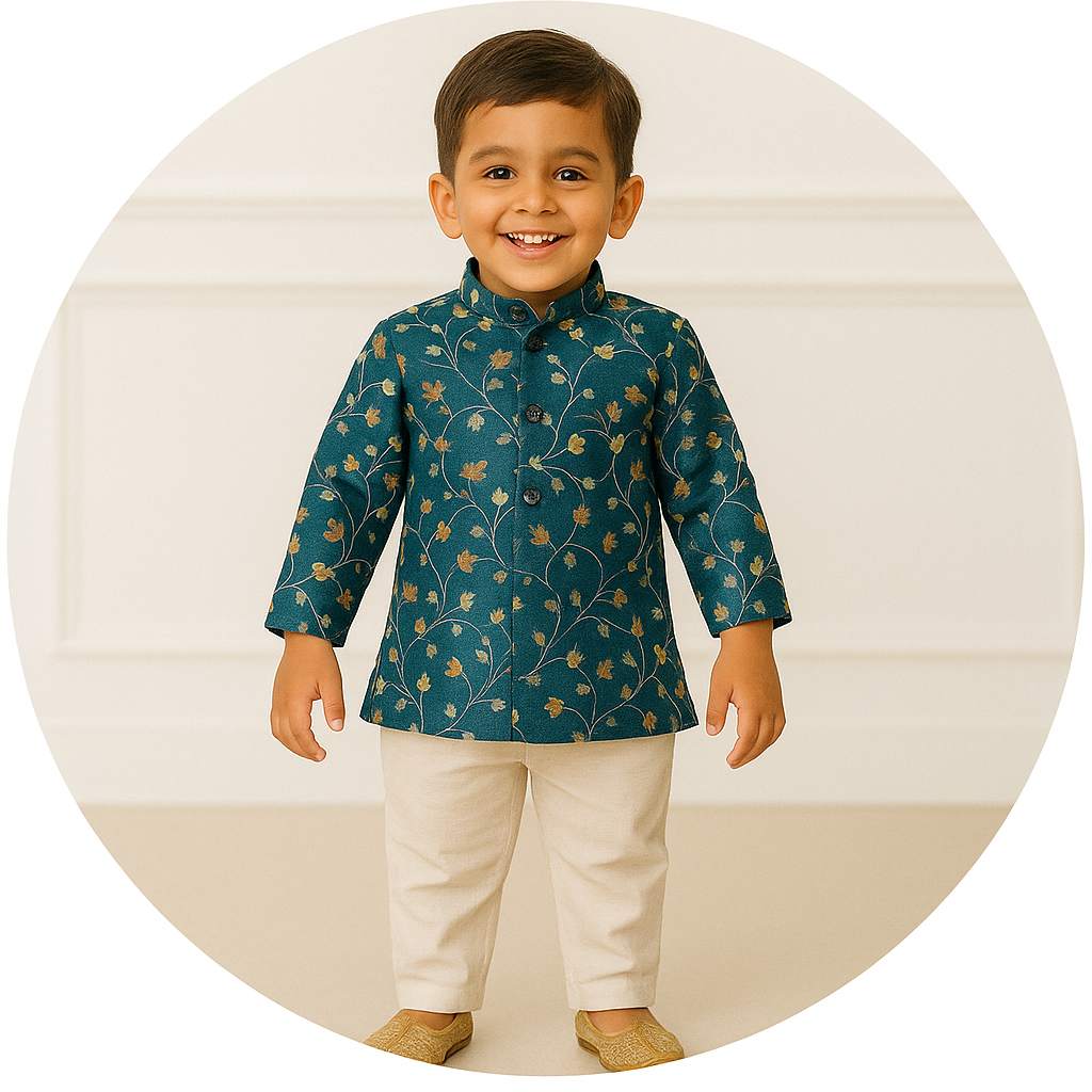 More sizes availableBoys Dusty Blue Kurta SetVendor: Mommies KidsSpecifications: Type: Floral design Sleeves: Full Sleeve Neck: Mandarin Collar Closure: Button Material: Cotton Silk Blend Bottom : Cotton Silk Blend Material Wash and Care Information: *Dry clean only. *Cold water is recommended. *Wash dark colors separately. Ironing Instruction: *Use warm iron. *Do...