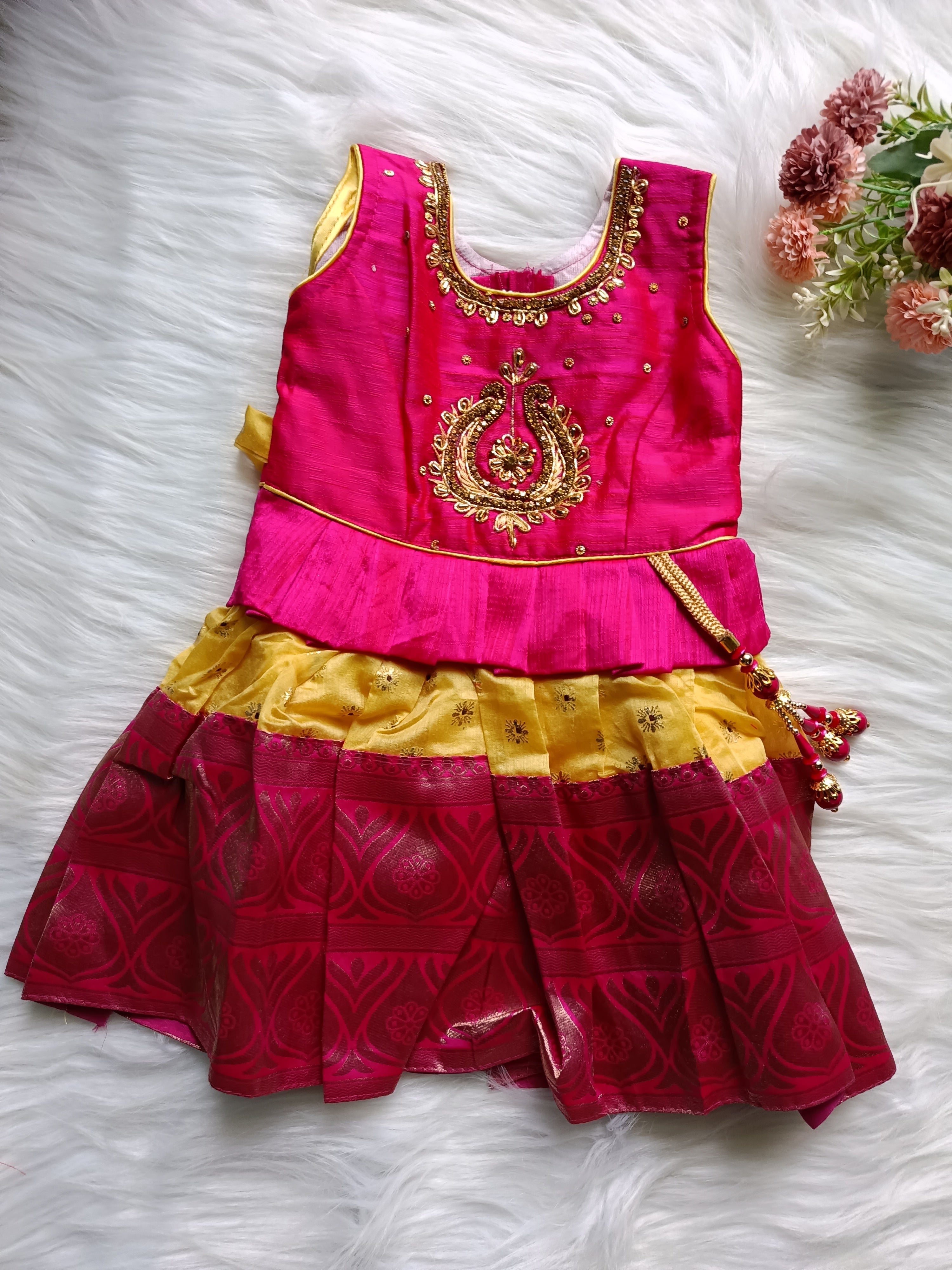 This colorful Pattu Langa is the perfect clothing choice for special occasions! Floral and geometric motifs adorn the pink blouse, while the blue border keeps the look traditional. Kids will be looking fashionable from the festive to the ethnic!
